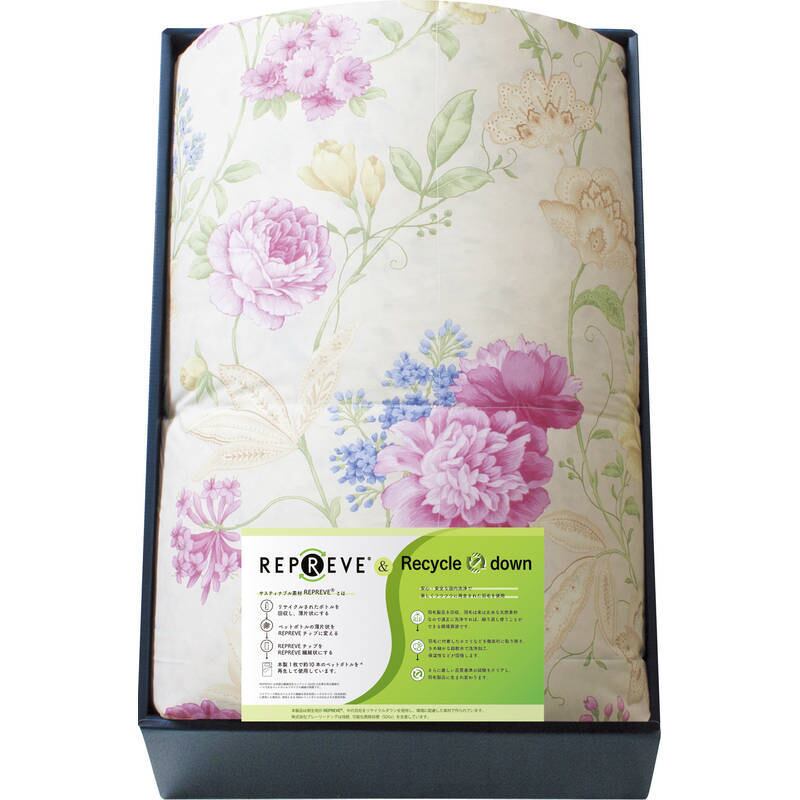 環境に配慮した国産羽毛布団です。側生地にREPREVER(リプリーブ)、中の羽毛はリサイクルダウンを使用し、環境に配慮した素材で作られています。